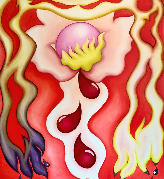 The composition of organic shapes flows with drops of blood and stands in flames, surrounding the re-emerging pearl-flower. Everything that is past and wrong, the dirt and dust of the past, flows away in drops of black tar, burned by a pure, honest flame. Transformation requires the sacrifice of blood; old membranes must shed for the pearl to bloom. Red and fire symbolize profound change, an unstoppable element beyond control. Pink and beige reflect the subtlety and sensitivity of the blossoming pearl, which, despite its delicacy, towers with strength.